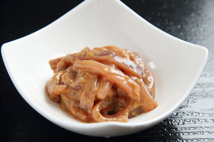 昔から人気の木村の塩辛です。まず、大ぶりの真いかを一夜干しにして旨味をギュッと凝縮します。秋いかの腑で旨さとコクをだし、天日塩で味付したものを2日間ほど熟成させて冷凍しているので、いかの旨味を存分に味わうことが出来ます。赤造りは皮が付いたまま、下足以外の部分が入っているので、よりいかの旨味を味わうことが出来ます。白造りは皮をむいて作るので上品な仕上がりです。解凍してそのままでももちろん、温かいご飯の上に乗せ、温かいお茶を注いでお茶漬けにしたり、薬味と一緒に貝焼にしたりと、様々なアレンジで更に美味しくお召し上がり頂けます。