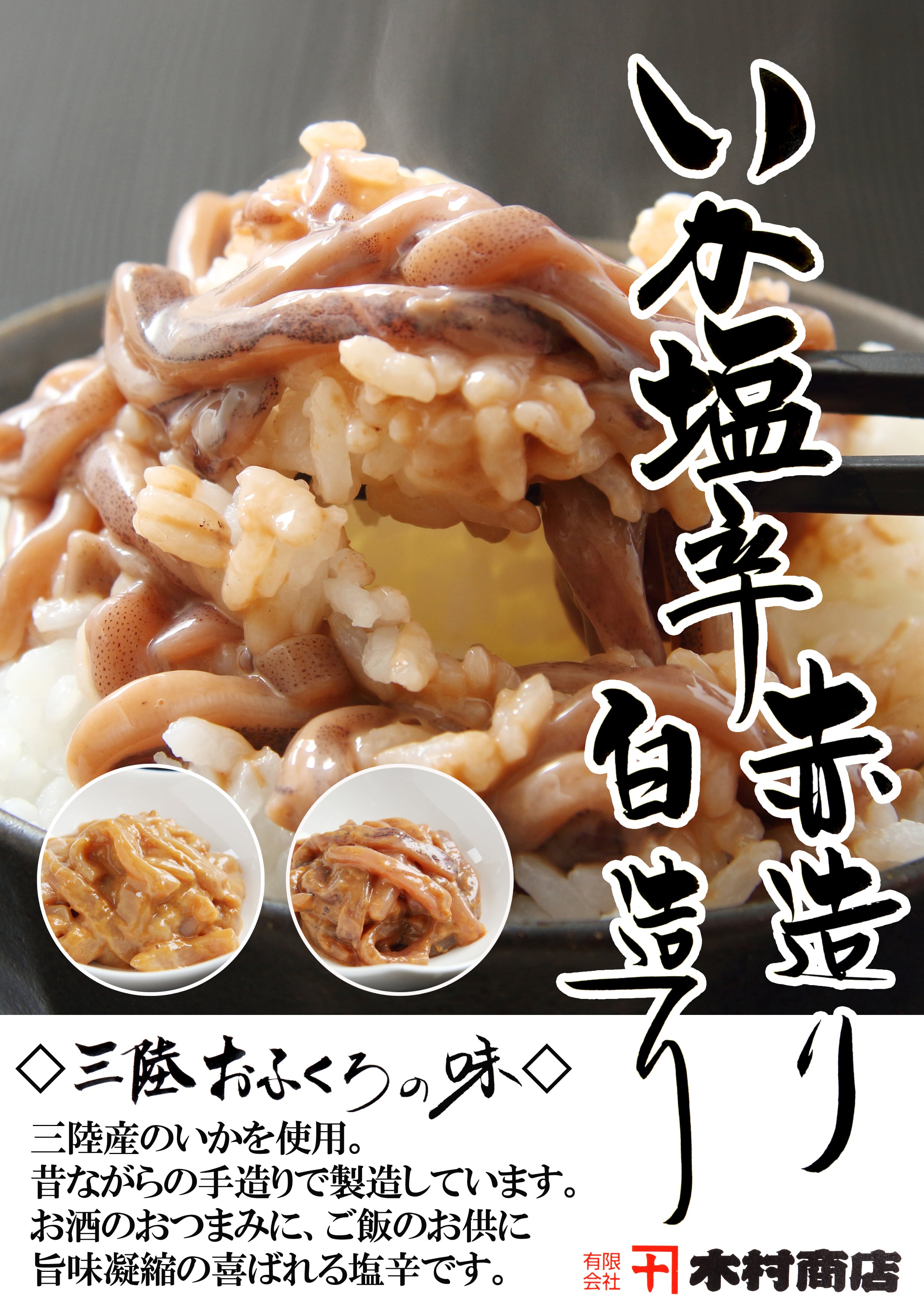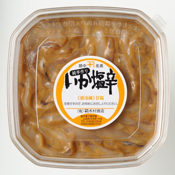 昔から人気の木村の塩辛です。まず、大ぶりの真いかを一夜干しにして旨味をギュッと凝縮します。秋いかの腑で旨さとコクをだし、天日塩で味付したものを2日間ほど熟成させて冷凍しているので、いかの旨味を存分に味わうことが出来ます。赤造りは皮が付いたまま、下足以外の部分が入っているので、よりいかの旨味を味わうことが出来ます。解凍してそのままでももちろん、温かいご飯の上に乗せ、温かいお茶を注いでお茶漬けにしたり、薬味と一緒に貝焼にしたりと、様々なアレンジで更に美味しくお召し上がり頂けます。